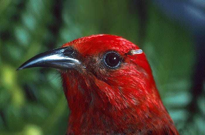 Native birds are discussed in the Draft Management Plan. Research priorities for the Hawai‘i ‘amakihi honeycreeper include “determining the ecological requirements of Culex mosquitoes at mid- and high-elevation forests, and developing methods to control mosquito populations.” Similar wording is used for ‘apapane honeycreeper research priorities, and the plan also states that future conservation actions specific to ‘apapane may include control of mosquitoes in degraded habitats. According to the EA, “‘apapane have the highest prevalence of avian malaria” of Hawai‘i’s native forest birds. The EA also notes that ‘apapane “breed in mid-elevation forests, which suggests some disease resistance.” ‘Amakihi have also developed a natural tolerance and resistance to avian malaria, but we may never know how well these honeycreepers might thrive in nature without aggressive human interferences like those deployed by the DLNR and their mosquito release agency partners.