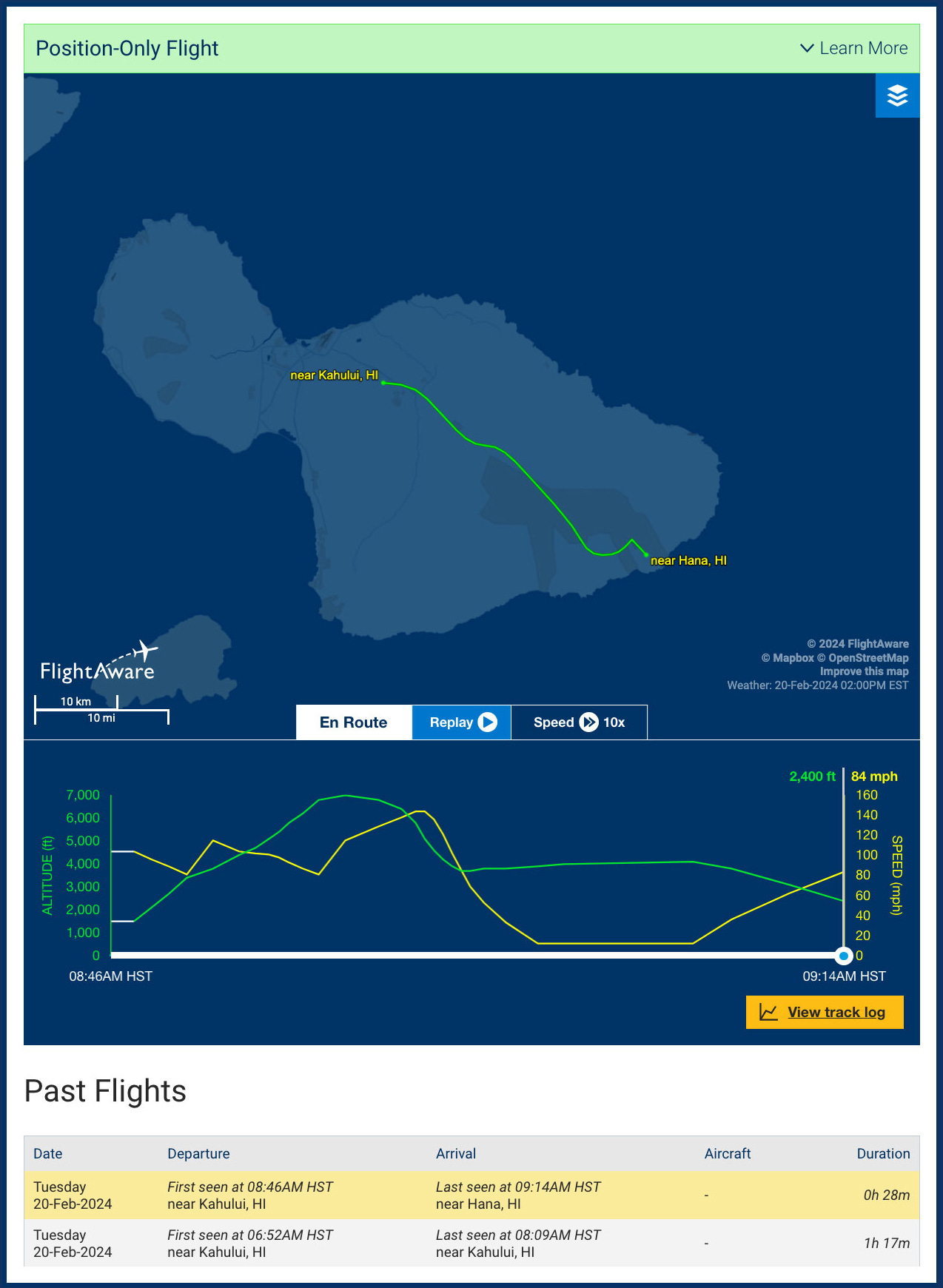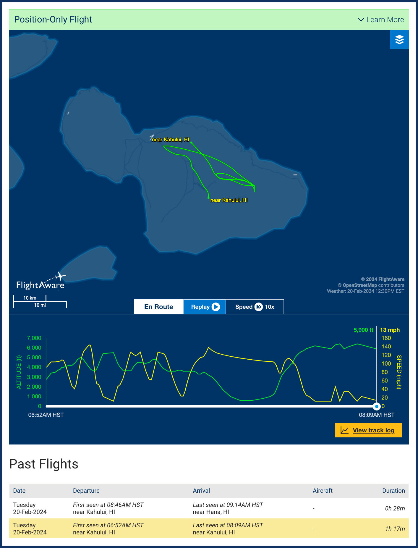 We can see from the flight track log that helicopter N690WA had multiple variations in speed and altitude on the morning of the accident. This flight may have been transporting crew members for the mosquito project. N690WA’s first flight returned to the Kahului area, then the helicopter departed again to the Kīpahulu Valley project area where the accident occurred. We do believe this flight accident could be connected to the Birds, Not Mosquitoes (BNM) multi-agency partnership bacteria-infected mosquito release experiment. The flight track log shows less variations in speed and altitude than the earlier flight, and it’s unclear if this second flight was part of an actual mosquito release. The crew may have been monitoring or transporting in connection with the project. The preliminary report narrative explains that the Hughes 369D helicopter N690WA “sustained substantial damage when the tail rotor was hit with unsecured rain gear that flew out.” Flying without doors on the helicopters for this mosquito release project can be hazardous.