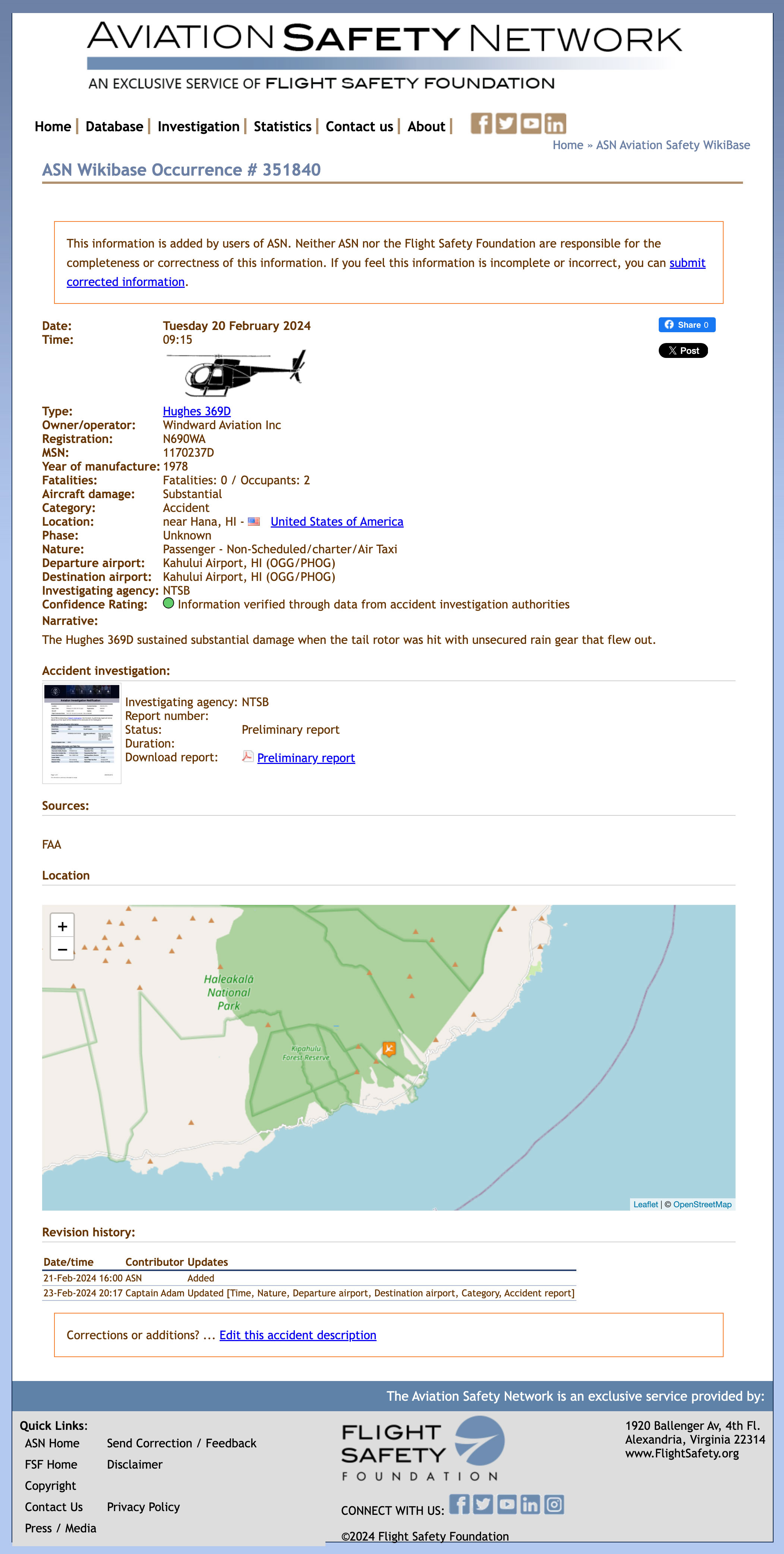 Last week there was a black helicopter flying low past me, under me. Maybe 200 ft. Or less. The Helicopter gauchos on Maui are up to something which may be more than just this release project. The jet fuel in HI is now rationed by Ché Roccocco, that's the CEO of legacy Chevron and Texaco infrastructure who is also the Chairman of the Board of Directors for RED CROSS HI. (Mauer/Rothschild) The consolidation of helicopter fleet, the rationing of jet and helicopter go-go juice, and the partnerships with federal and state agencies are all suspicious activity on the part of the helicopter gauchos as far as I can tell. To me it is not so surprising that this crash is suppressed in the media as the media seems biased in glamorizing the helicopter gauchos, and there appears to be a plan to phase out small helicopter tour operators and phase in larger operators who use hardware which is indistinguishable from military hardware (just my thinking out loud). Mahalo Tina.