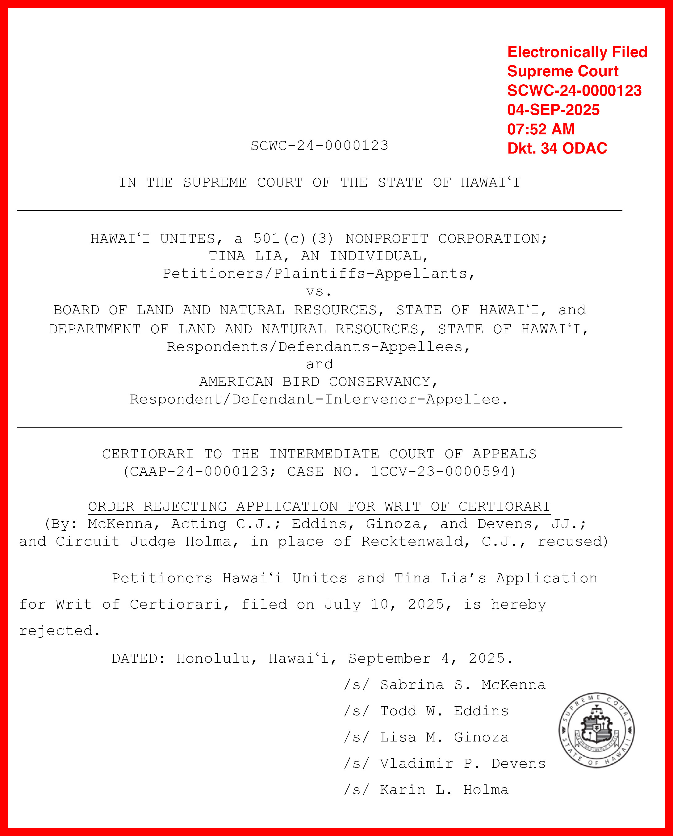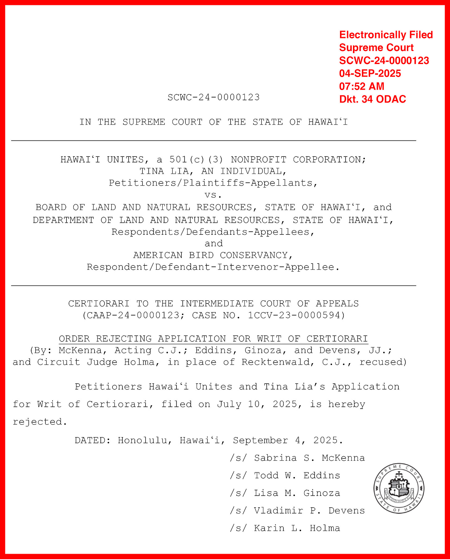 This week, the State of Hawai‘i Supreme Court filed an order rejecting Hawai‘i Unites’ application for writ of certiorari. This means that our case to stop the mosquito releases on Maui and require an environmental impact statement won’t be moving forward.